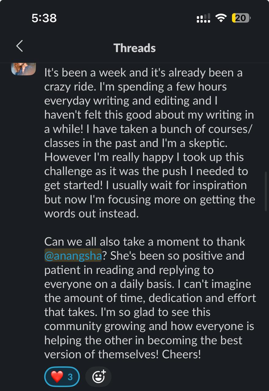Anangsha offered individual feedback to all participants based on where they are in their writing journey. This is a LOT of work - and Anangsha truly cares about helping people, and generously offers her time and expertise. I am glad to be privy to thoughts on writing from a superstar like Anangsha. I wholeheartedly recommend learning from Anangsha - your writing will certainly improve.