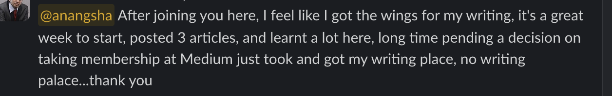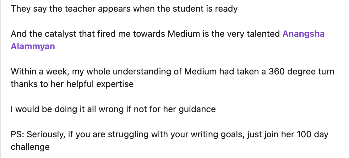 I found Anangsha's program incredibly useful for fast-tracking my Medium journey. She answered all my questions about publishing on Medium and continues to provide feedback on the stories of everyone in the program. Thanks to her, I’ve connected with a community of driven writers on Medium from the very first day of joining. Thank you, Anangsha!