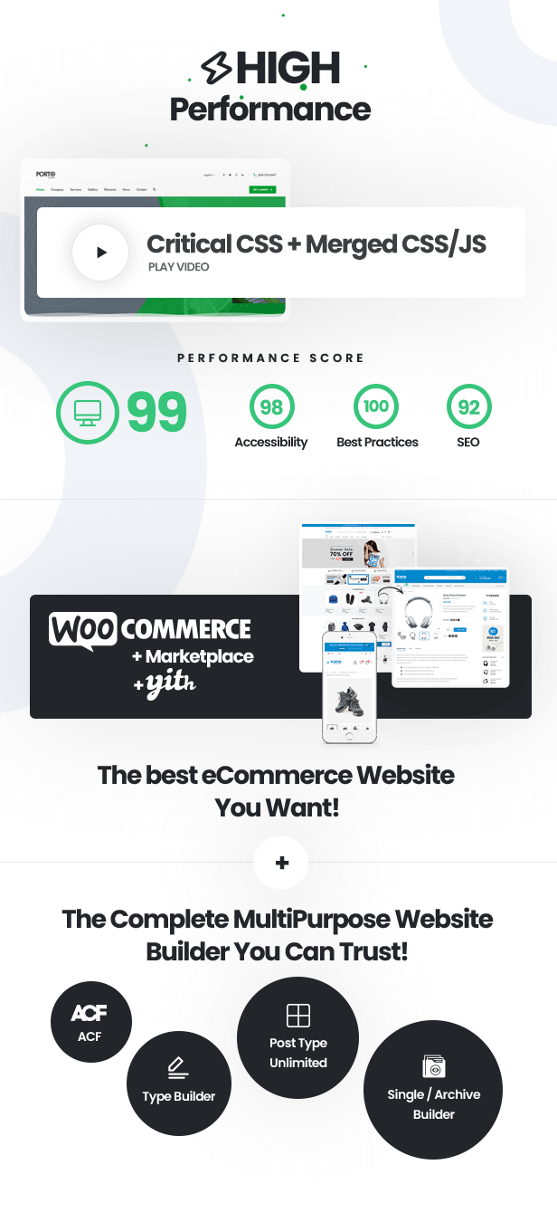 Porto introduces a lot of new features and demos, we also enhanced our speed Optimization wizard and reached top performance scores in ThemeForest. Porto releases 5 wonderful features – Soft Mode, Merged JS and CSS, Critical CSS, Type Builder, Single and Archive Builders. Soft Mode is a new feature that can be surely called a huge development. It has made possible to edit anything. You can build site without touching a single line of code using full site builders. Critical CSS helps you reduce the rendering time of your site. Your site may suffer from too many styles yet not all of them are used at first time. Critical CSS helps you escape from all this stuff. You will be able to achieve high performance. Merged JS & CSS is also a important point in the new version. It limits the request count so even though you don’t use cache plugins, you can expect high speed on mobile devices. With Post Type Builder, any archive post layout can be built to be harmonized with your website. As for Single & Archive Builder, most themes want customization yet for their single and archive pages. Never mind. Porto will do all those things for you and build a layout that is in your head. Eventually Porto has improved all its Google Lighthouse metrics above 98 on desktop and 70 on mobile without any cache plugins. For example Beauty Salon, Dentist, Auto Service….